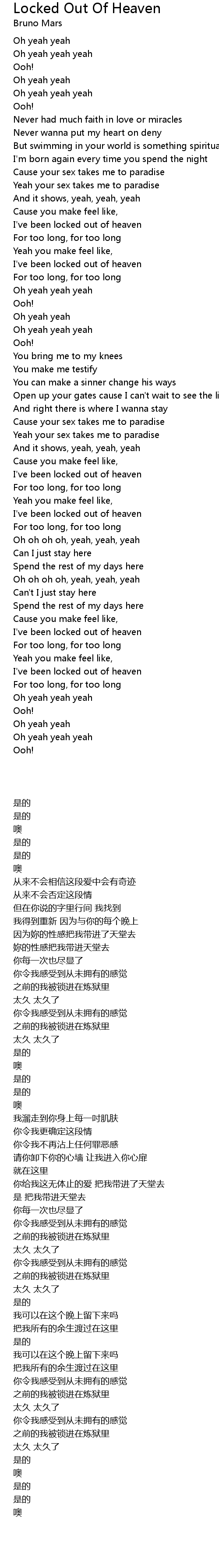 You bring me to my knees you make me testify you can make a sinner change his ways open up your gates cause i can t wait to see the light and right there is where i wanna stay cause your sex takes me to paradise. Locked out of heaven lyrics. I m born again every time you spend the night ooh. Oh yeah yeah yeah yeah oh yeah yeah oh yeah yeah yeah yeah.