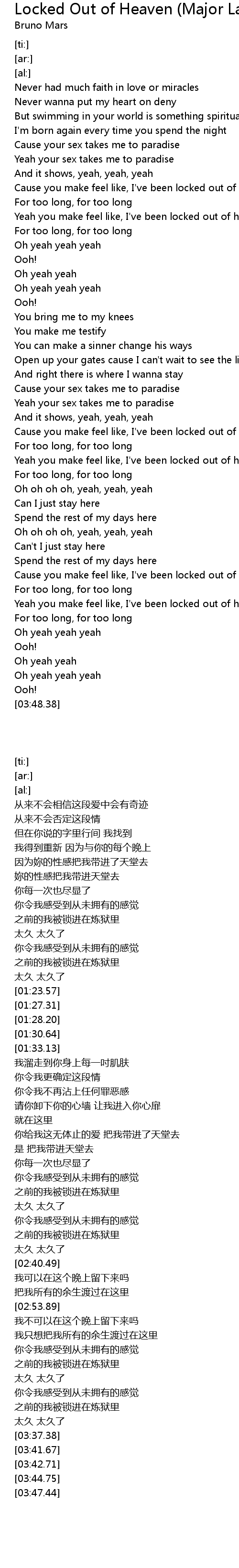 I ve been locked out of heaven for too long for too long. I ve been locked out of heaven for too long for too long yeah you make me feel like i ve been locked out of heaven for too long for too long oh yeah oh yeah yeah yeah oh yeah yeah oh yeah yeah yeah you bring me to my knees you make me testify you can make a sinner change his ways open up your gates cause i can t wait to see the light. Oh yeah eh eh eh yeah eh eh eh ah. Never had much faith in love or miracles ooh.