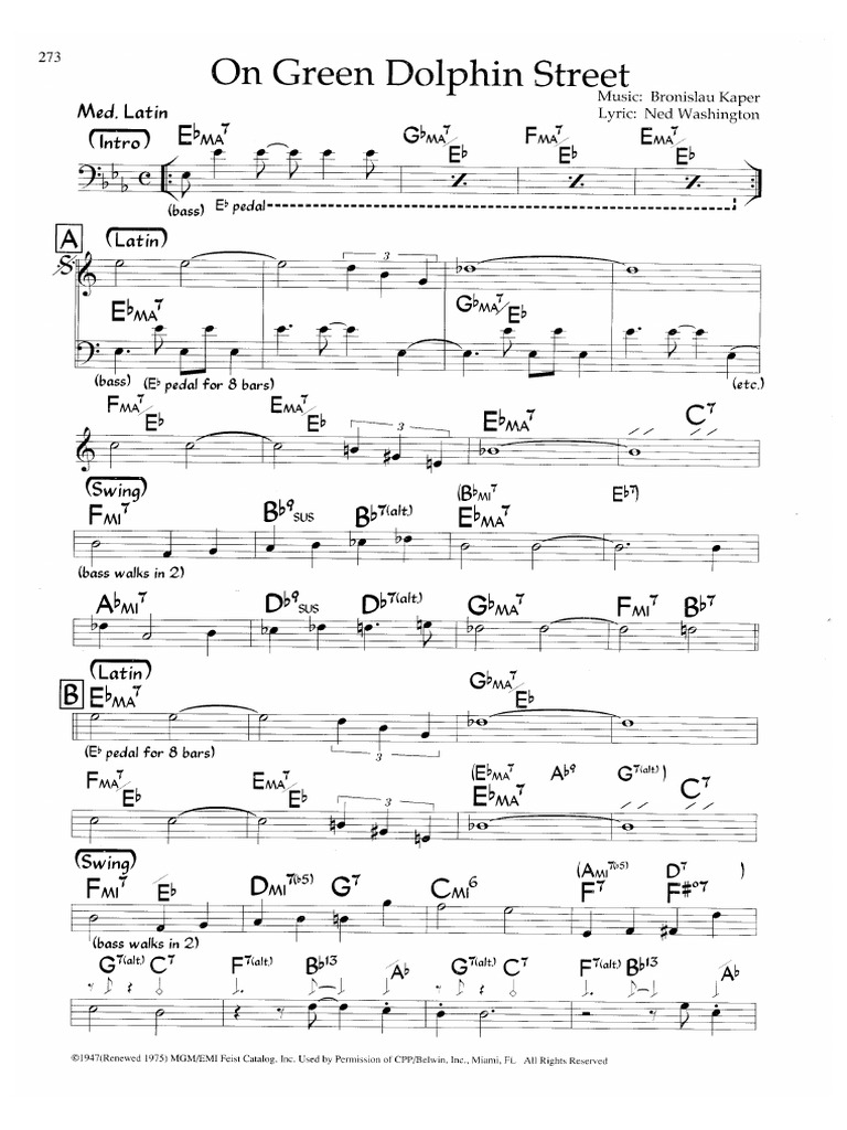 Swing g 7 c7 f pedal dpi eb7 bb 7 solos fa latin f pedal 1. On green dolphin street is a standard tune that commonly switches between latin and swing. On green dolphin street bb solo sheet mike tomaro. Swing e 7 9 music by bronislau kaper lyrics by ned washington ga 2.