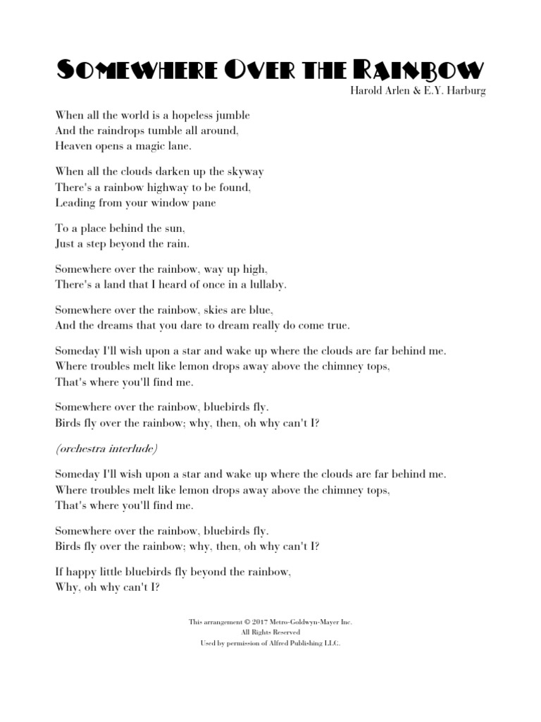 Somewhere over the rainbow text. Somewhere over the rainbow original songtext. Somewhere over the rainbow bluebirds fly and the dream that you dare to. Wake up where the clouds are far behind me where trouble melts like lemon drops high above the chimney top thats. Dreams really do come true someday i ll wish upon a star.